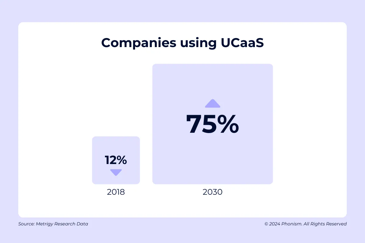 By 2030, Unified Communications-as-a-Service (UCaaS) is projected to be used by more than 75% of companies for their communication needs including calls, meetings, and messaging.